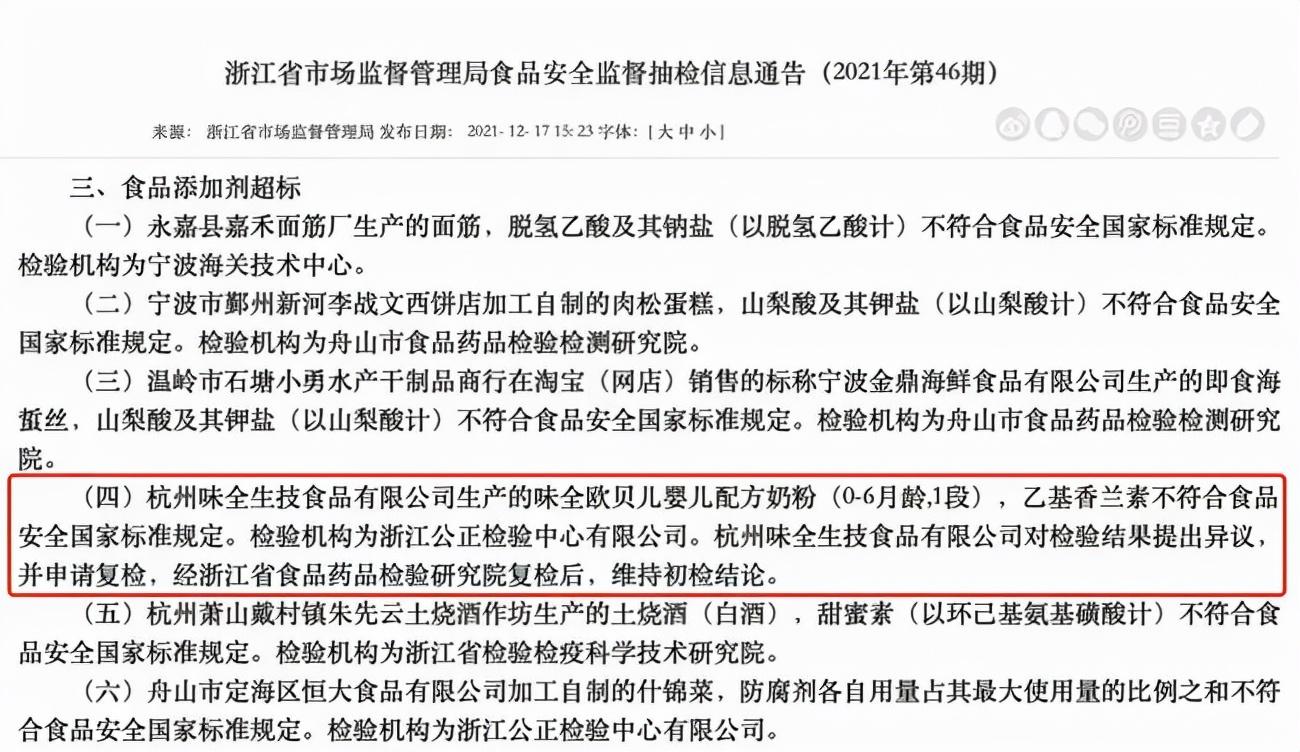 通报显示,标称杭州味全生技食品有限公司(简称“味全生技食品”)生产的“味全欧贝儿”婴儿配方奶粉(0-6月龄,1段,108g/罐,2021/8/9),乙基香兰素检出值为103.5μg,而标准规定不得使用。味全生技食品对检验结果提出异议并申请复检,复检维持初检结论。
