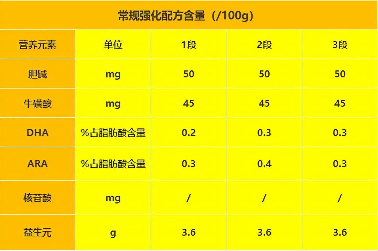 基础配方我们就不多说了 ,6项常规强化配方只添加了5个,缺少了核苷酸,不过味全欧贝儿DHA添加量比较理想,均高于市面平均水平。